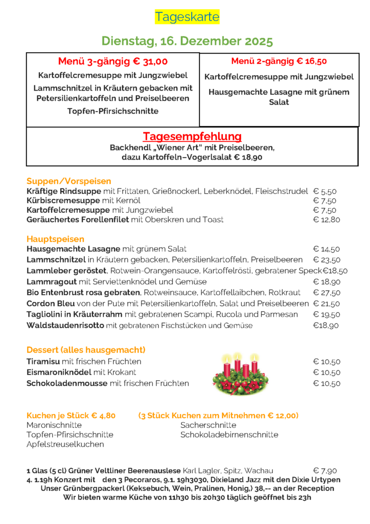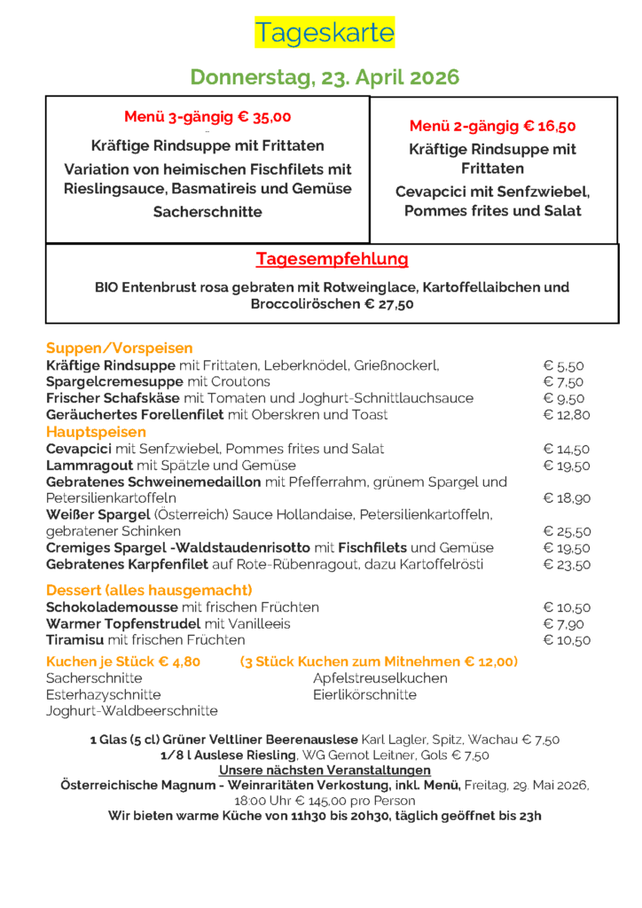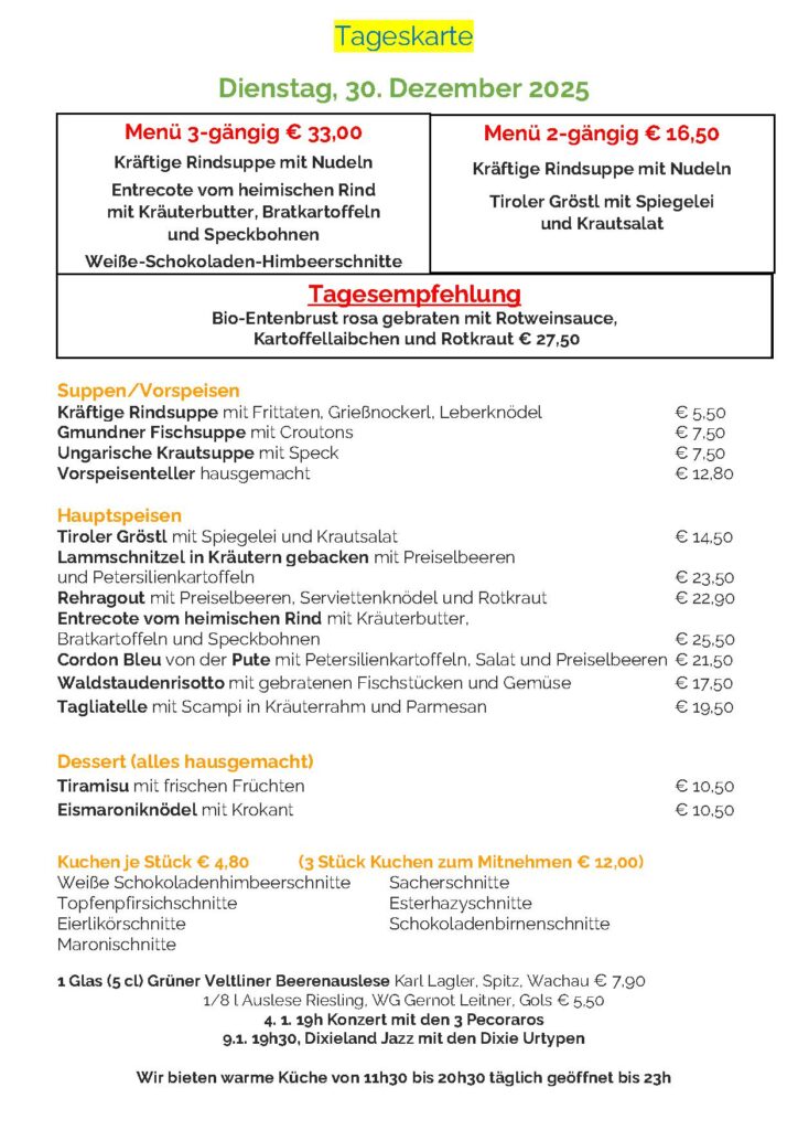 Kein Ruhetag! Warme Küche 11:30 - 21:00 Uhr (Küchenannahme bis 20:30 Uhr)